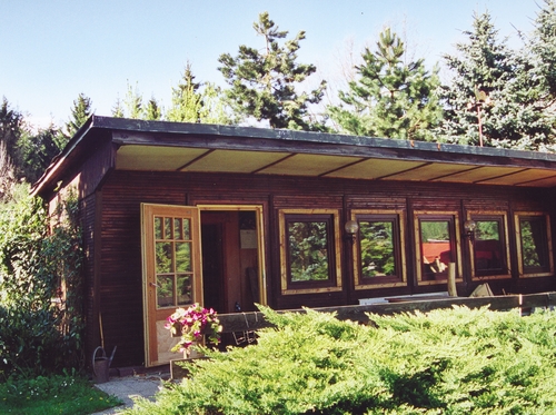 Der geräumige Bungalow liegt idyllisch auf einem separaten Grundstück des Waldcampingplatzes. Man betritt ihn durch einen kleinen Vorraum mit Garderobe.