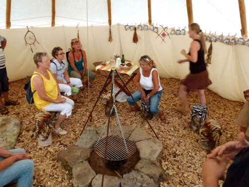 Gruppen-Tipi „Sternenzelt“ Das Gruppen-Tipi, hat mit 7 Metern Durchmesser einen wesentlich größeren Innenraum. Der Fußboden ist mit weichen Holzhackschnitzel isoliert und gepolstert und eine massive Feuerstelle befindet sich im Zentrum. Es wurde ebenfalls den Sioux-Indianern nachempfunden, was hier jedoch nicht im Fordergrund steht, sondern die Zeltform als Raum für Begegnung und Spiritualität. Es bietet bis zu 15 Personen Platz, um darin zu nächtigen. Es kann aber auch für Tagesaktivitäten, z.B. Geburtstagsfeiern, ohne Übernachtung gebucht werden. Sitzplätze im Inneren gibt es dann für ca. 35 Personen.