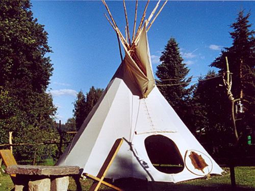Das Tipi ist wahrscheinlich das am klügsten durchdachte Nomadenzelt, das in vollkommener Harmonie mit der Natur steht. Es wurde von den nordamerikanischen Ureinwohnern entwickelt, nicht um kurz in freier Natur zu übernachten, sondern um das ganze Jahr über darin zu wohnen. Gut belüftet, im Sommer kühl, im Winter warm, bietet es Schutz bei jedem Wetter und Unwetter. Schnell wurde es auch von den weißen Trappern und Cowboys als sichere Behausung in unendlicher Wildnis entdeckt. Zwei solche Tipis können findet ihr auf unserem Gelände.